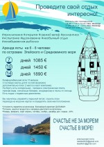 Комфортабельная яхта 14 метров. 3 гостевые каюты для 6 гостей (возможно дополнительно плюс 2 места в кают компании). На борту есть холодильник , газовая и злектрическая плита, горячая вода, солнечные батареи, кондиционер и тенты от солнца. Есть лодка с подвесным двигателем. Вы научитесь управлять парусной яхтой, строить план перехода на морских картах и определять своё местоположение. http://happinessinthesea.biz.ua/