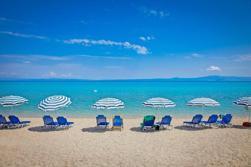 Пляж Ханьоті розташований в одноіменному селищі на популярному та мальовничому півострові Кассандра (Халкидіки) в 120 м від готелю. Це невеликий пляж з жовтим м'яким піском і підходить, як для сімейного відпочинку з дітьми, так і для активних розваг. Пляж обладнаний усім необхідним для комфортного відпочинку. Пляж знаходиться серед парків і живописної соснової рощі. Море чисте з водою яскравого бірюзового кольору.